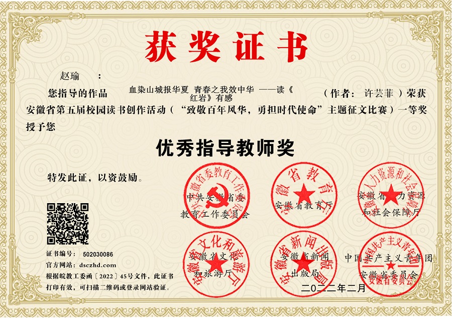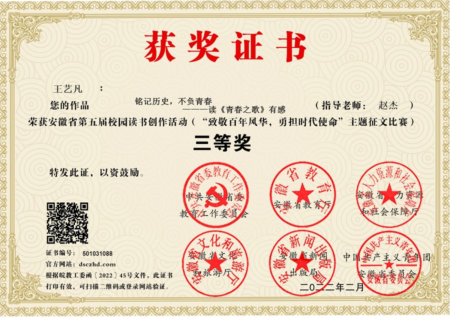 教师赵瑜征文《千秋史册,一片丹心——读< 习近平总书记重要讲话文章选编>有感》、学生许芸菲征文《血染山城报华夏青春之我效中华——读< 红岩>有感》(指导教师,赵瑜)获一等奖,夏聿焱征文《肩担道义,执笔著文》(指导教师,曹多保)、刘文玥征文《筚路蓝缕红星柄耀》(指导教师,马克山)获二等奖,王艺凡征文《铭记历史,不负青春———读< 青春之歌>有感》(指导教师,赵杰)、俞文轩征文《北斗高悬 ——读< 长征>有感》(指导教师,赵瑜)获三等奖,邵飞征文《从“八一”南昌起义谈我党在各个历史关头的英明抉择》(指导教师,陈晨)、赵甜征文《从觉醒年代的觉醒青年到新时代的新青年》(指导教师,翟斌)获优秀奖。学生王又然生肖邮票设计获三等奖。