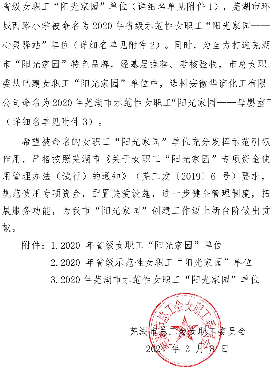 据悉,本次芜湖市县区共有9家单位被命名为2020年省级女职工“阳光家园”单位。附中将充分发挥示范引领作用,为芜湖市“阳光家园”创建工作迈上新台阶做出贡献。
